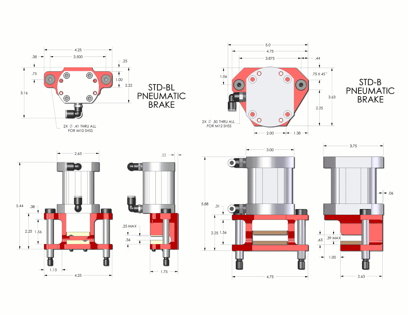 The STD-B and STD-BL series of pneumatic caliper brakes are lightweight floating calipers designed for use on fixed discs. The caliper body is machined and anodized from billet aluminum. The brake pad is sintered metallic.