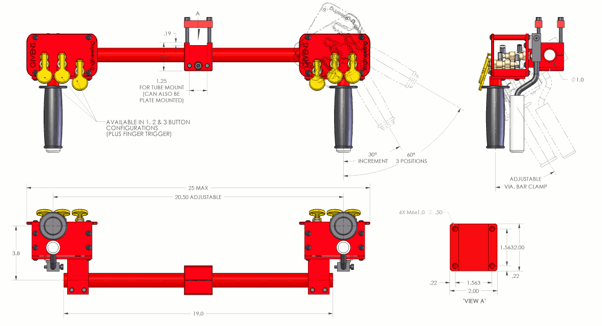 Our handlebars are designed for ergonomic operator control solution for pneumatic end effectors/lift assists. Each STD-H assembly includes right and left hand control handles, handlebar and a stem mounting clamp. The control handles are available in 1, 2 or 3 push-button configurations and each has one finger trigger. All components feature lightweight, anodized aluminum construction.
